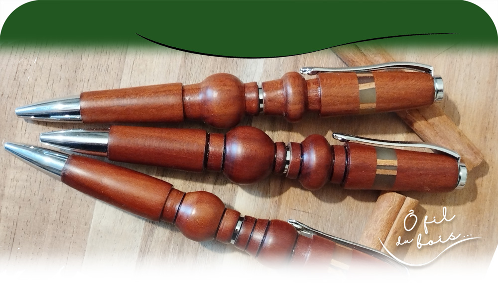 Lors d’une exposition à Masevaux, un enfant de 12 ans s’arrête sur le stand Ô fil du bois. Il souhaite une personnalisation d’un stylo-plume sur le thème train, car il est passionné de trains. Son père donne carte blanche et comme cet enfant est issu d’une double culture : Burkinabé du côté de sa mère et Français du côté de son père, la base du stylo est réalisée avec du chêne, et les rails avec de l’ébène et du wengé, tous deux bois africains.