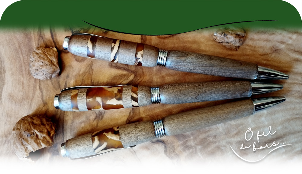 Cette gamme de stylos est réalisée avec du bois de noyer d’Amérique, et en inclusion dans la résine teintée des morceaux de coquille de noix.