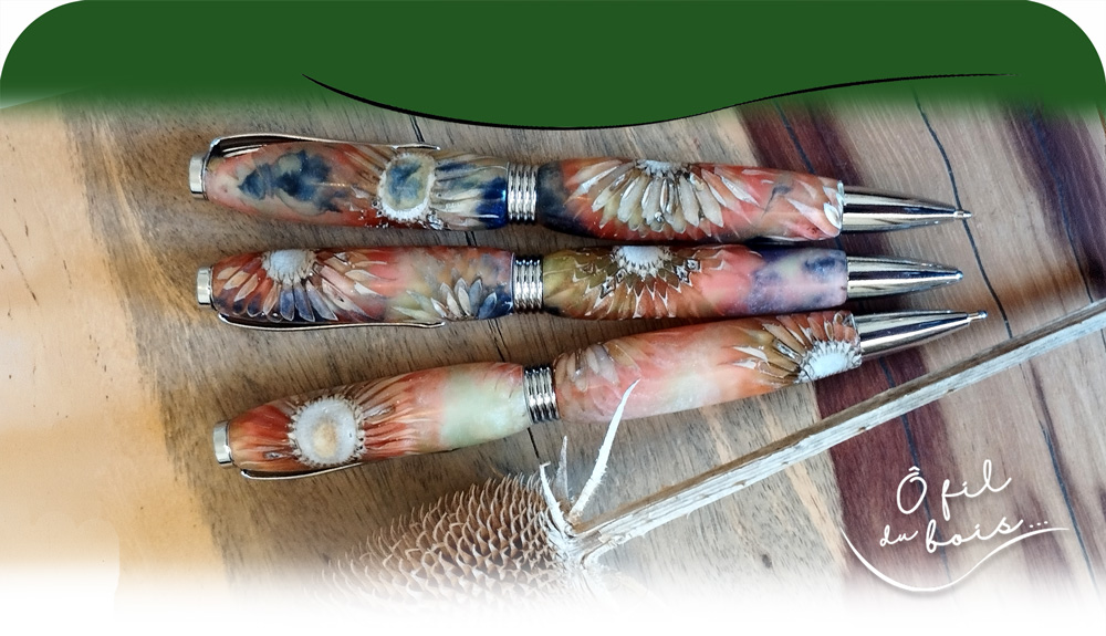 Les stylos sont réalisés avec des cardères séchées, en inclusion dans de la résine époxy et un mélange de pigments de couleur.
